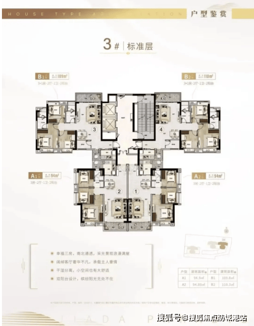 3. 109㎡三房两厅两卫:该户型为改善型刚需户型,空间宽敞,布局合理,适合四口之家居住。户型南北通透,客厅开间宽敞,连接超大景观阳台,采光通风俱佳,可满足日常休闲、会客需求;三个卧室均朝南,主卧配备独立卫生间和衣帽间,私密性强,提升居住品质;次卧空间宽敞,可作为儿童房或老人房,布局灵活;厨房U型设计,连接生活阳台,方便储物和晾晒;公共卫生间干湿分离,使用便捷,避免早晚高峰拥挤。