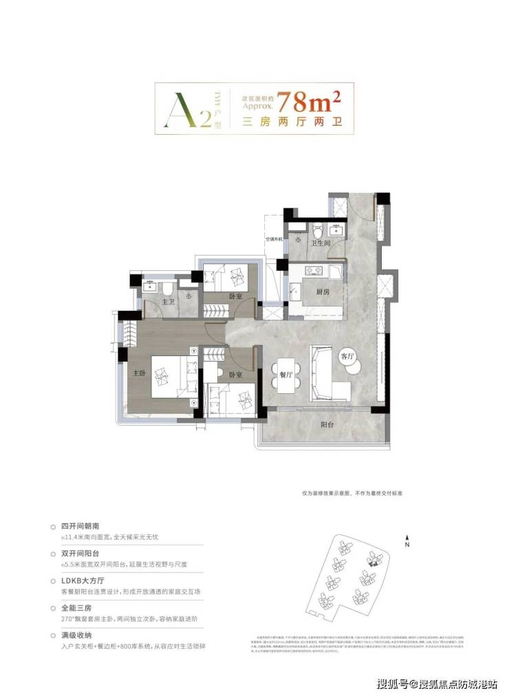 主力户型解析:79㎡三房两卫(紧凑刚需款,三开间朝南,动静分区,适合小家庭)、108㎡三房两卫(爆款户型,南北通透,主卧带套间,客厅面宽达3.8米,储物空间充足)、142㎡四房两卫(改善顶配,双阳台设计,主卧带步入式衣帽间,适合多孩家庭),其中79㎡、89㎡户型去化率超85%,成为市场热门款。