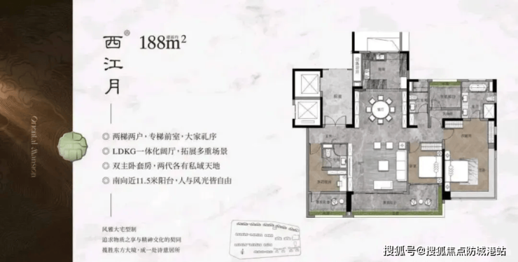建面约268㎡改善大平层则是项目的旗舰户型,三梯两户配置并包含独立保姆电梯,彰显尊贵身份;LDKG大方厅面积近120㎡,空间开阔通透;主卧带270°全景飘窗和双台盆卫浴,无论是观景还是日常居住,都能享受到极致的品质感。