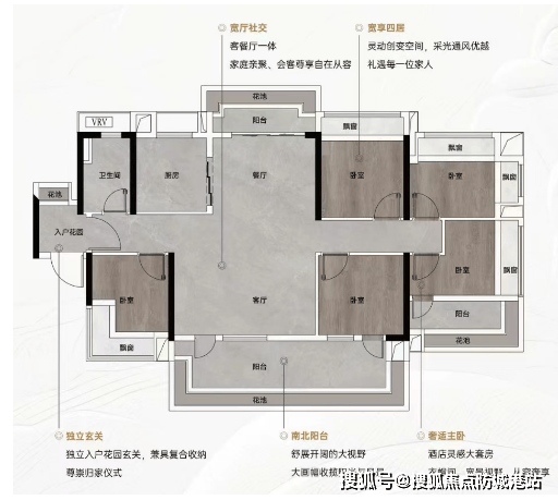 建面约 115㎡四房两卫:南北对流户型,四开间朝南,南向宽景阳台搭配花池赠送,空间阔绰。北侧餐厅区域赠送花池,可打造餐边柜,形成南北通透效果。主卧 L 型花池设计,景观视野好,不占用室内面积,实用性强。