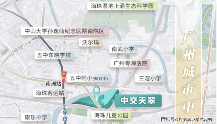 项目落址于海珠区南洲地段,位于广州新中轴线延长段的重要节点。地理位置上,北接珠江新城,南通番禺万博,西接老城生活区,东临琶洲国际会展商务区,三大核心商务区环伺,构成强大通勤辐射圈。