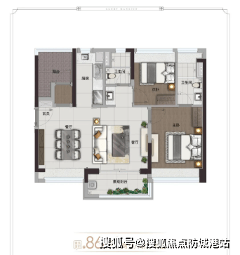 建筑面积约106平方米的三房两卫户型,是项目中的主力明星产品。其最大优势在于约6.1米阔尺南向景观阳台,带来极致的视野与采光。室内空间设计极具巧思,样板间展示了将客厅与相邻书房打通的可能性,瞬间形成一个超大尺度的家庭厅,其空间感可媲美市面上120平方米以上的户型。若保持原有格局,独立书房也可满足居家办公、阅读学习的需求。若未来家庭人口增加,也可轻松将此空间改造为第四间卧室,实现从三口之家到二孩家庭的完美过渡,生命周期覆盖极长。