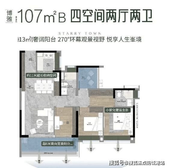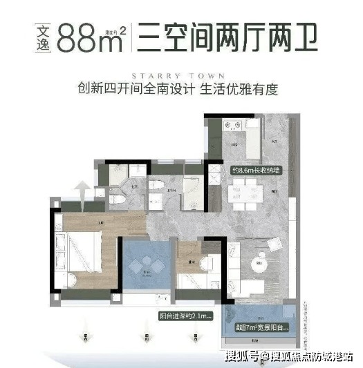 88㎡三房两卫:罕见四面宽小户型,三卧室全部朝南,超11米景观面让阳光洒满每个角落;约10米收纳墙系统化整合储物空间,小户型也能拥有大格局。
