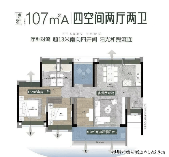 107㎡A户型:南向观景玄关提升归家仪式感,客厅与主卧南北对流,双面宽阳台延伸生活视野,交互式方厅灵活可变,满足现代家庭多元场景。