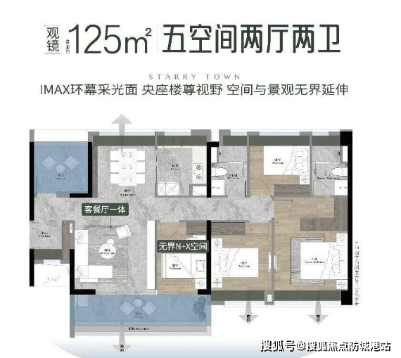 125㎡五房两卫:餐客一体化大方厅,南北通透,双阳台+满飘窗设计,实用率与舒适度兼得,堪称改善型家庭的理想之选。