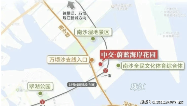 交通方面利好显著,项目距离已通车的深中通道南沙线收费站约1公里,驱车自驾半小时即可到达深圳前海,加强了与深圳的联系。距离在建的18号线南延线二十涌站约500米,该线路设计时速高达160公里/小时,未来西线至中山市区、东线直抵珠海拱北口岸通车后,将成为大湾区交通枢纽,实现地铁半小时内畅达广州、深圳、中山、珠海,交通便利性将大幅提升。
