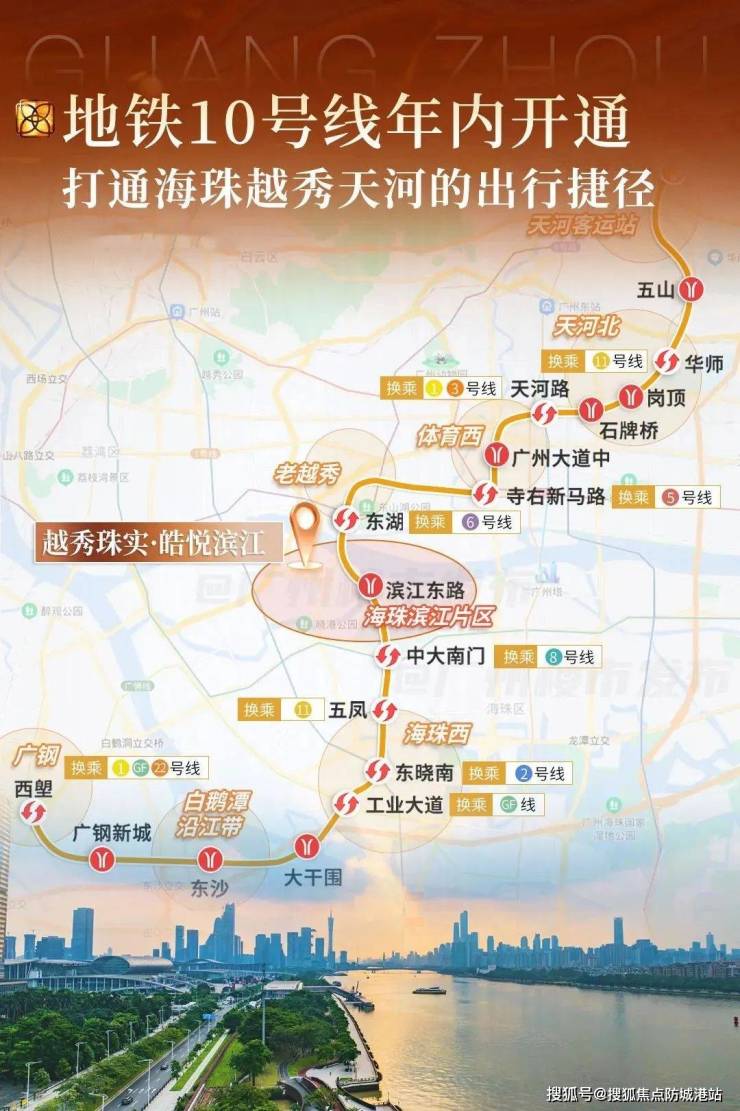 越秀・珠实・皓悦滨江拥有全维交通网络,畅达大湾区,出行便捷高效。自驾方面,通过江湾大桥可直连越秀区,快速到达天河,路网发达,方便自驾出行。地铁方面,虽距最近的 2 号线市二宫站约 1.2 公里需接驳,但 1 站可达江南西、海珠广场,2 站至公园前;东侧在建 10 号线滨江东站未来开通后,1 站到东湖,2 站至五羊邨,3 站达广州大道中,地铁出行将更便捷。公共交通与自驾相结合,可快速通达广州各核心区域,轻松连接大湾区主要城市,满足日常通勤与跨城出行需求。