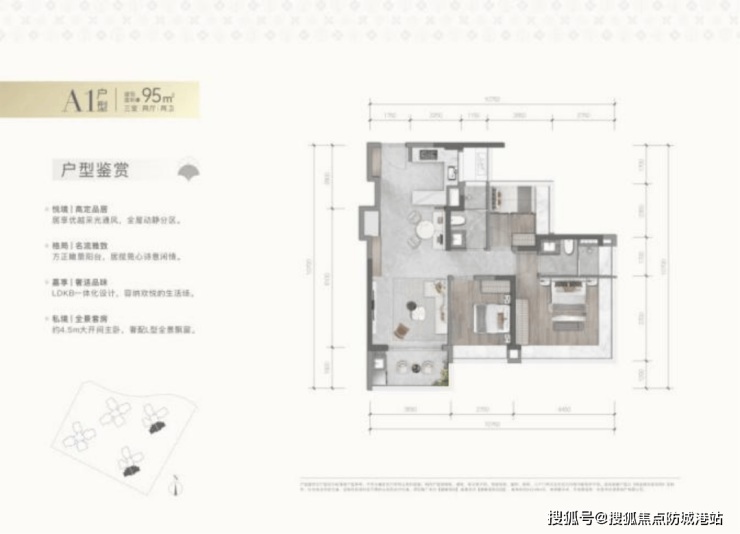 约95㎡三房:主打高赠送率和百变场景,主卧采用180°无柱转角窗设计,采光极佳,适合年轻家庭首置。