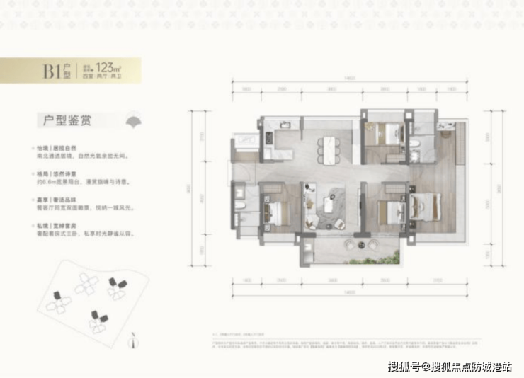 约123㎡四房:越级产品,拥有360°无界主卧和南北通透布局,实际空间体验堪比旧规140㎡户型,适合改善家庭。