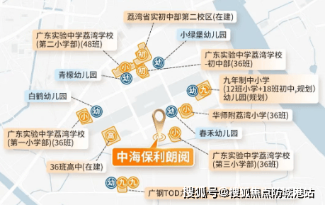 中海保利朗阅毗邻广东实验中学荔湾学校第三小学部(简称“省实三小”),仅一街之隔,步行即可到达。项目自身还配建有两所中学,其中包括一所省级名校广东省实验初中,预计2025年竣工。整个板块规划有32所学校集群,从小学到高中一站式全龄段教育,打造15分钟教育圈。