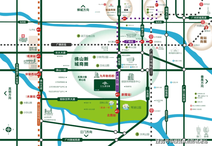地铁赋能:项目步行约800米即可抵达规划中的新隆地铁站。该站点作为佛山轨道交通网络的重要节点,未来开通后将实现“3站直达佛山新城核心区,5站接驳广州南站”的极速通勤。这意味着,您可以在清晨从容地在家里享用早餐,随后轻松踏上地铁,半小时左右即可抵达广州南站换乘高铁,或到达佛山新城CBD办公,真正实现“双城生活”的自由切换。
