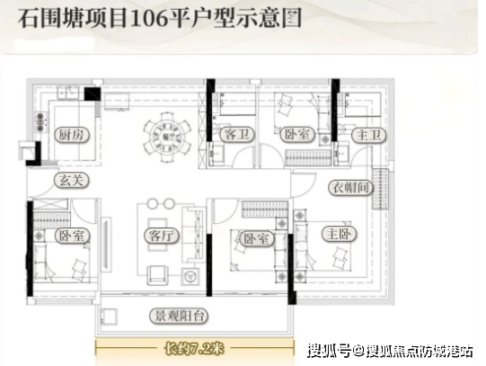106㎡户型采用四开间朝南设计,配备超长景观阳台,采光充足,视野开阔。主卧为套间设计,配备独立卫生间与衣帽间,保障业主隐私与居住质感;多开间朝南的设计让每个房间都能享受充足阳光,适合人口较多的家庭居住,预计总价455万左右,性价比突出。