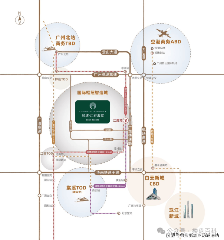 枢纽地位:项目坐落于广州发展下一个白云新城的江高新城,刚好与珠江新城、白云新城形成的城市中轴之上,占位四大枢纽的几何中芯。北承空港经济区、广州北站商务TOD东风,南邻白云站TOD动脉,西邻广州国际港,潜力庞大。
