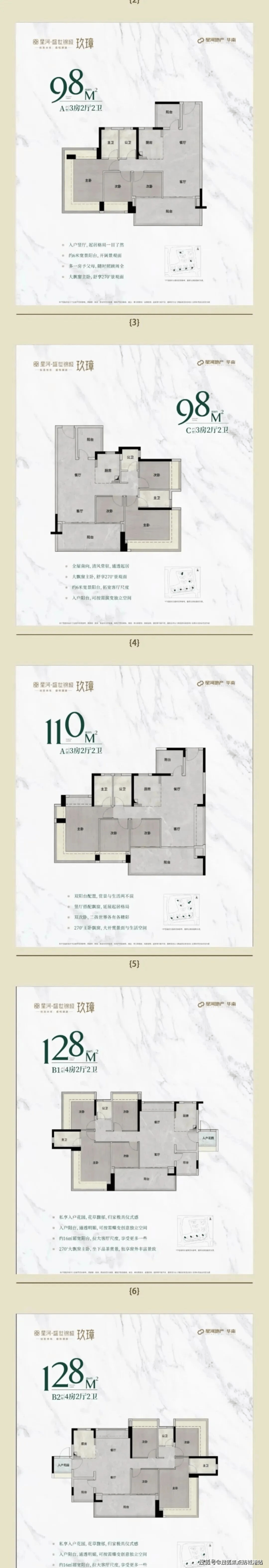 主力户型覆盖 95-138㎡三至四房,适配刚需到改善的全周期需求。98㎡户型堪称刚需爆款,四开间朝南的设计让采光最大化,主卧配备 270° 飘窗,既拓展了视野又增加了实用空间,无论是三口之家还是三代同堂都能从容居住。128㎡改善型户型采用双主套设计,南北通透,空间分区合理,长辈与年轻人的居住私密性互不干扰,适合追求品质生活的家庭。