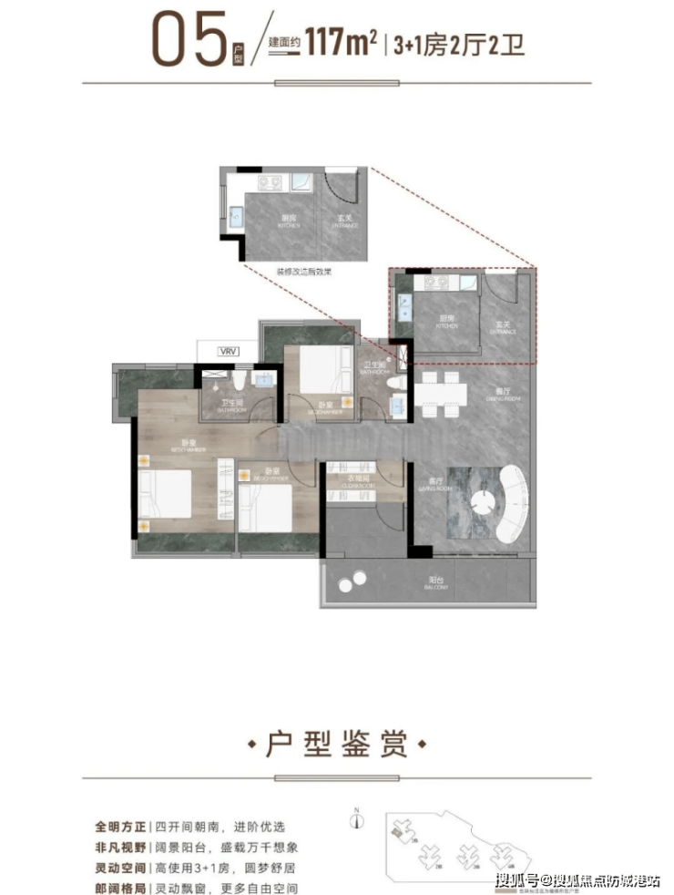 悦府组团主推90-117㎡三四房产品,全部采用新规设计,使用率接近100%,真正实现“小面积大享受”。其中,90㎡三房创新采用横厅布局,客餐厅一体化设计显著提升空间通透感,并提供东南向与西南向两种朝向选择;109㎡四房延续高实用理念,全屋飘窗可拆除,业主可灵活改造为书柜、收纳区或扩增室内面积;117㎡四房则进一步优化功能分区,主卧配备独立卫浴,满足三代同堂家庭的私密需求。交付标准亦诚意十足:LOW-E玻璃有效隔绝噪音与紫外线,厨房轨道门提升空间利用率,部分户型采用无飘窗设计,为后期装修提供更大自由度。公区配置双入户大堂与高速空调电梯,归家仪式感与实用性兼得。