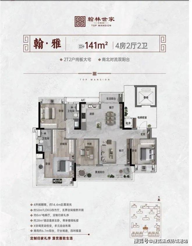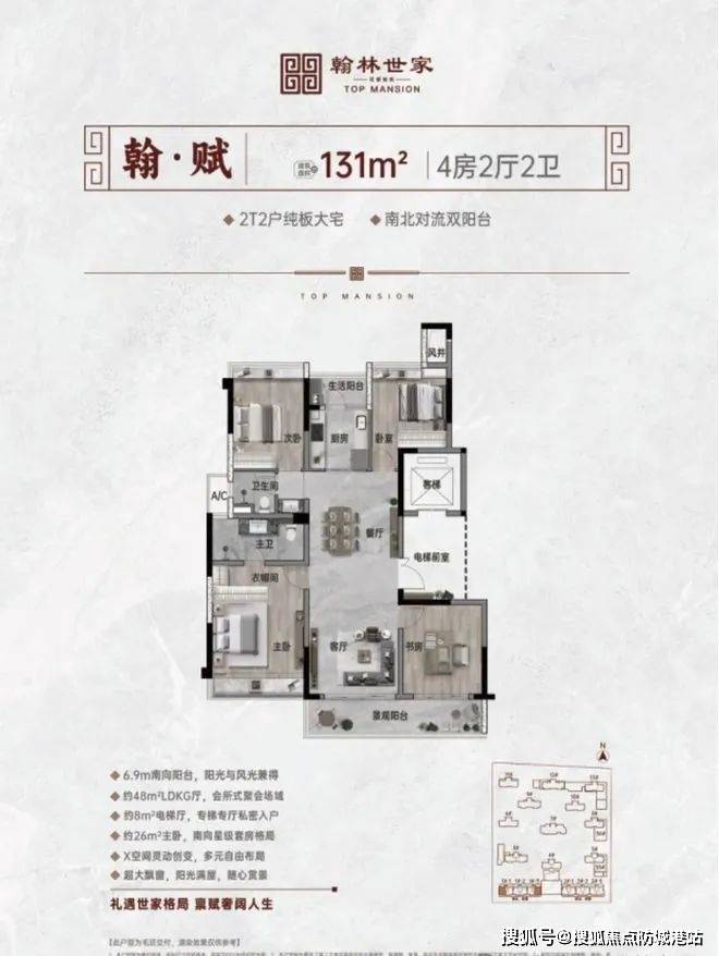 :新中式纯板大宅,2T2 户,户户南北对流 。纯粹小高层,专梯专厅入户,毛坯交付 。南北双阳台,全南向奢阔主卧 。