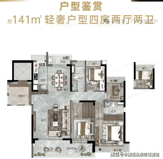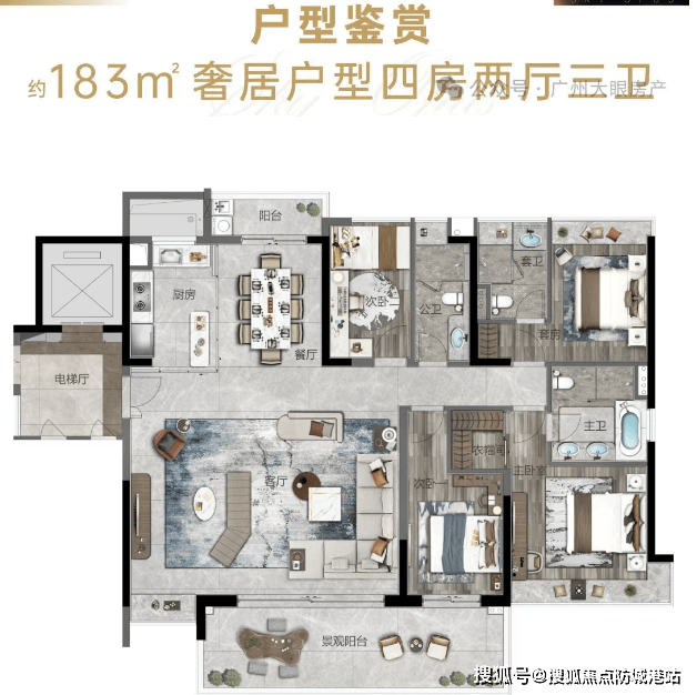 约183㎡环幕大宅:此户型打破了传统的景观限制,采用板式设计排布,南北对流,双阳台,全明户型,并且所有房间均朝南,享受无敌山景。设计上特别注重空间尺度感,如大方厅、中西厨岛台设计以及双主套设计等,满足了现代家庭对于高品质生活的追求。尤为值得一提的是,该户型配置了约8.3米长的南向观景阳台,提供270°广角视野,让居民尽享一线山景之美。