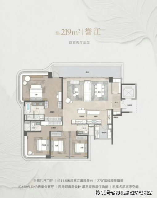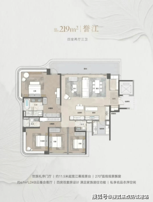 228㎡四房:67㎡云峯会客厅+11.5米江幕观景台,双套房设计,满足多代同堂或高端接待需求。