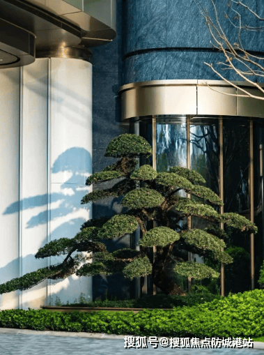 在下沉式庭院中央,一棵约5米高的迎客松巍然矗立,搭配普拉达绿的奢石背景墙,成为引人注目的景观焦点。它不仅是一道独特的风景线,更是岭南建筑特色“四水归堂”理念的重要体现。与无边界的流水相映成趣,营造出松韵、水波、月影交融的意境。罗汉雕塑、水景与玻璃幕墙巧妙融合,在阳光洒落的天井中,与自然展开一场静谧的对话。