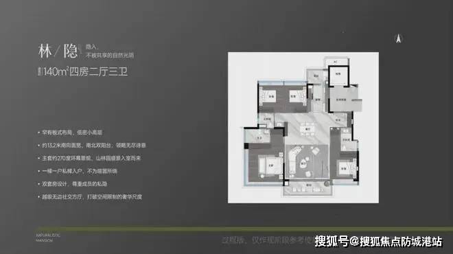 140㎡四房:LDKG一体化设计,双主套+双阳台,窗地比38%,主卧270°飘窗揽湖景。