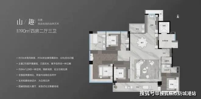 252㎡五房:全套房设计,15米转角阳台,122㎡定制化客厅,彰显塔尖身份。