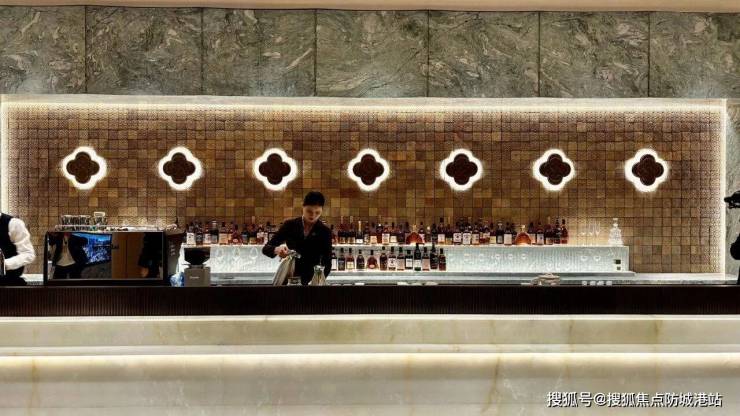 来到会所的核心区域——吧台,也就是未来的行政酒廊,你会有一种置身五星级酒店大堂的错觉。这里面向巨大的落地窗,视野开阔,采光极佳。透过玻璃,你可以清晰地看到下方的下沉庭院,绿意盎然,生机勃勃。