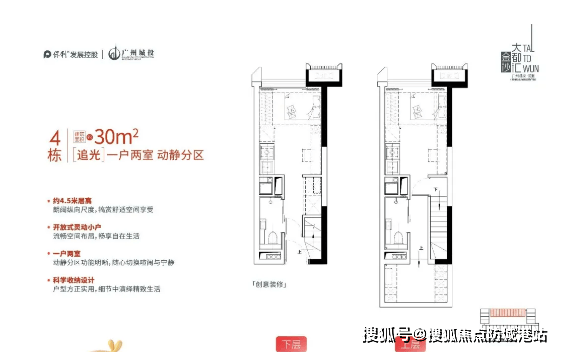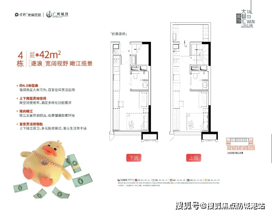 金沙大都汇最圈粉的,当属它的双钥匙复式户型。30-42㎡的面积段,乍一看不大,但4.5米的层高做了上下两层,而且是独立入户设计,相当于花一套房的钱,买了两套独立空间,这种“买一得二”的设计,在广州主城真的很少见。
