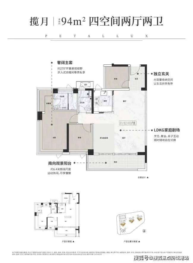 户型设计:75㎡三房(使用率120%)、94㎡四房(LDKG一体化)、108㎡四房(15米南向面宽)。