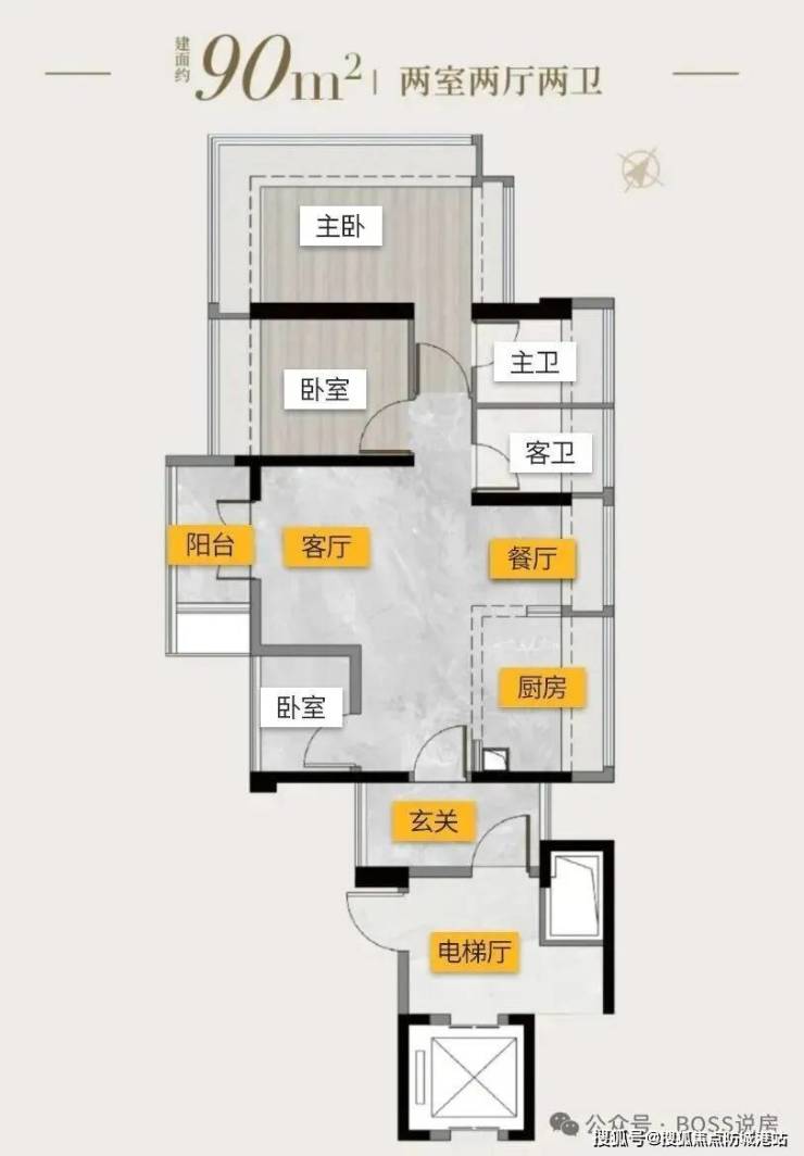 格局:板楼 2 梯 2 户,专梯专户,四房三卫,双主卧设计