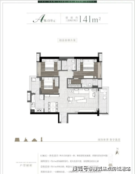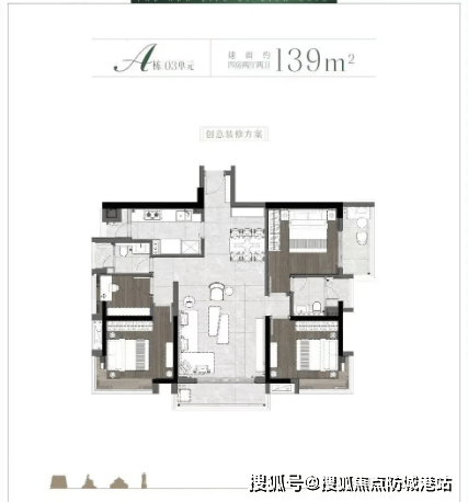 140㎡四房两厅两卫:空间分配合理,动静分区明确,餐客一体设计,厨房配备博世品牌厨具,尽显品质生活。