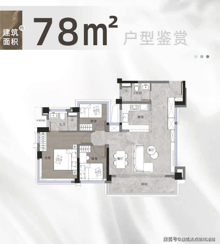 建面约78㎡三房两卫:该户型建面使用率高达115%-121%,套内使用率144-152%,实际使用面积约90-95㎡,超越一路之隔竞品99㎡三房的使用空间,秒杀市面上绝大多数90㎡以内产品。户型布局紧凑合理,三房设计满足刚需家庭居住需求,两卫配置提升日常便利性,适合年轻夫妻或三口之家。