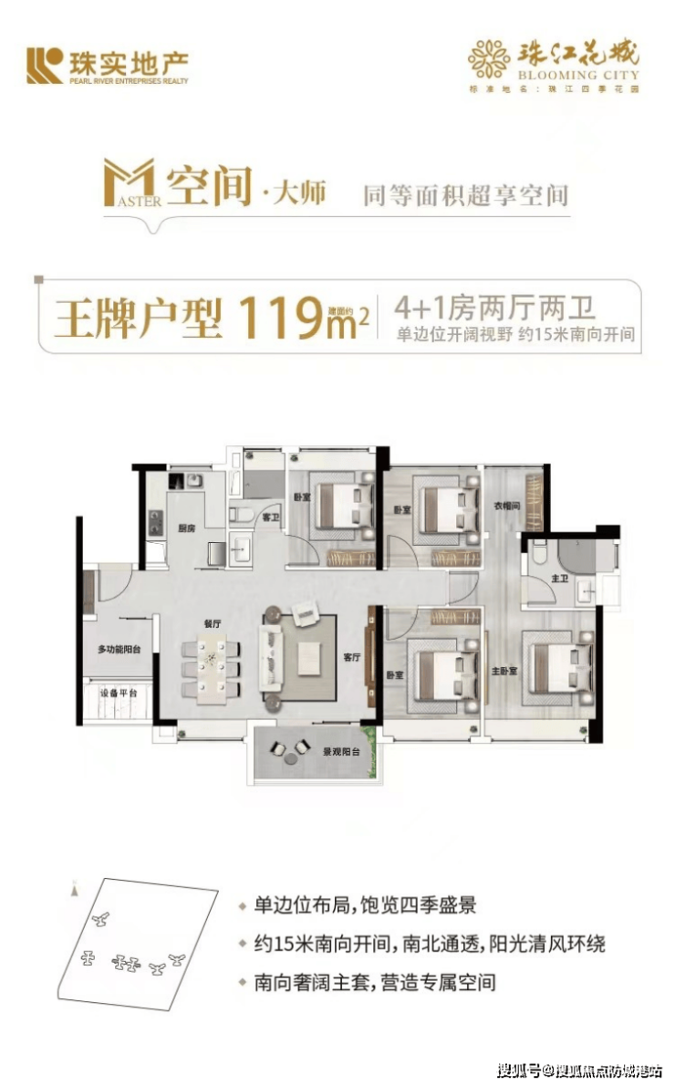 119㎡五房两卫:双阳台+U型厨房,得房率91%,总价600万起;