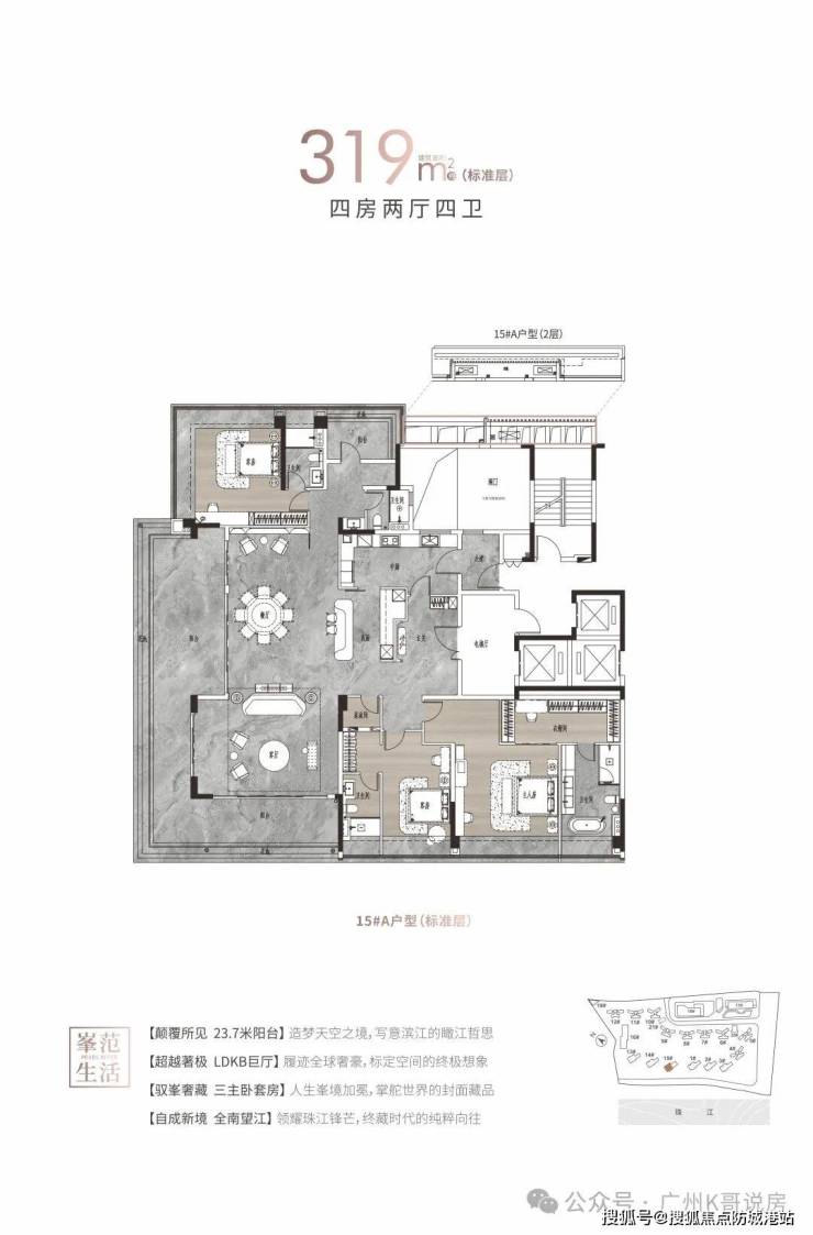 在产品设计上,江语上品苑针对改善型客户的需求,推出了建面约125-142平方米的四房产品以及建面约214-313平方米的大平层产品。根据广州市规划验收标准测算,项目户型的实用率普遍达到103%左右,这主要得益于飘窗、阳台等半赠送面积的合理设计。