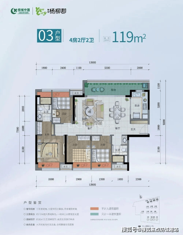 115-119㎡四房则是刚改家庭的首选。四开间朝南,北向还能看江景。适配多孩家庭,空间利用率很高。总价约165万起。这个户型的拓展空间很大,阳台面宽大,居住舒适度明显优于同面积的竞品。