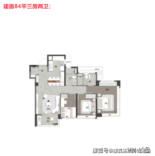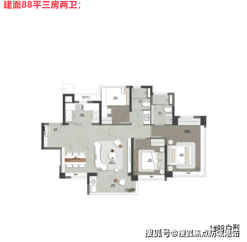 建面88平三房两卫:紧凑实用,适合年轻家庭或首次置业者。全南向设计,采光良好。