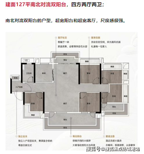 建面127平南北对流双阳台,四方两厅两卫:超宽阳台和客厅,尺度感强,南北对流,通风效果好。