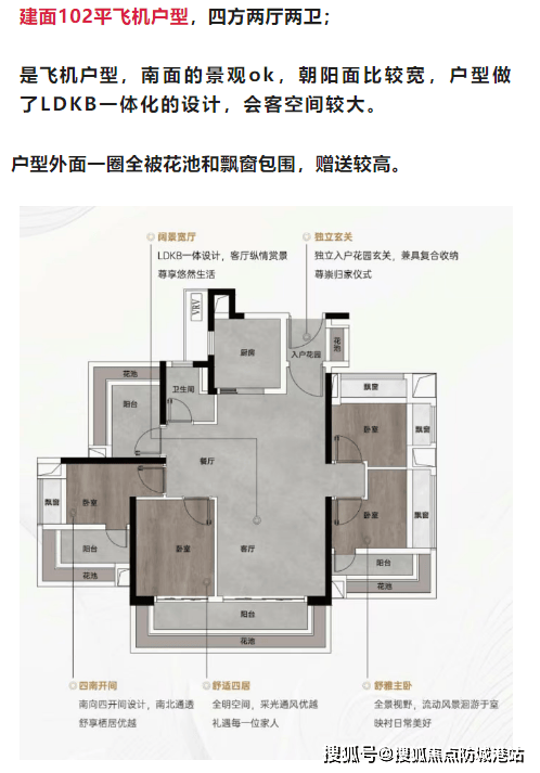 建面102平飞机户型,四方两厅两卫:南面景观开阔,朝阳面较宽,LDKB一体化设计,增加会客空间。