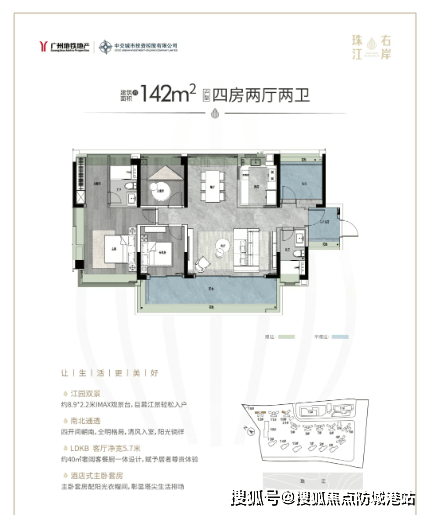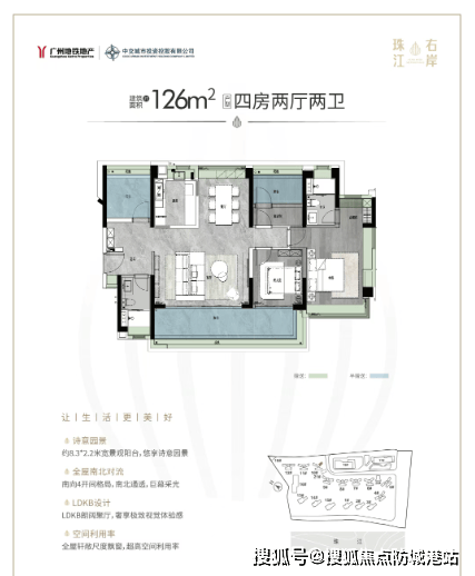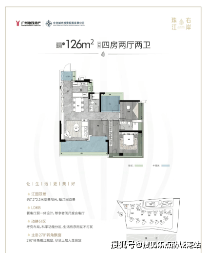 建面约126平方米四房两卫:提供横厅和竖厅两种选择,均采用LDKB一体化设计,配备超长景观阳台。