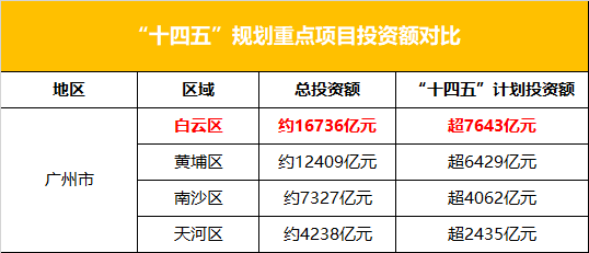 “十四五”规划对白云的投资力度占据到第一位,共有524项重点建设工程,总投资额达16736亿元,一个区的投入相当于一些大省全年的GDP。
