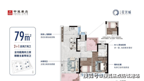 中建星光城的户型设计独具匠心,全南向户型设计,确保了充足的采光和通风。项目在售户型包括建面约 69㎡的主城臻稀南向三房,三开间朝南,阳台开间达 3.2 米,实用率高达 94%;建面约 79㎡的主套双卫 3 房,东南向瞰园林,通风采光俱佳;还有建面约 87㎡、91㎡和 100㎡的南北通透三房和四房,满足不同家庭的居住需求。户型方正,空间布局合理,功能划分明确,为居民提供了舒适的居住体验。
