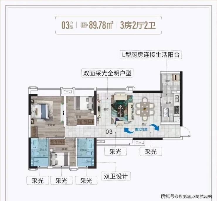 89平3房2厅:南北对流设计,通透明亮,享受无敌视野江景。