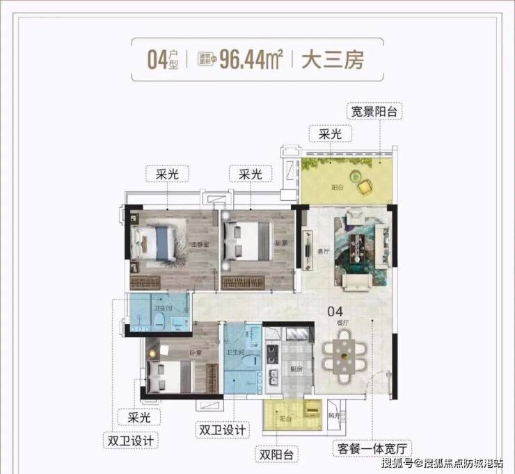 95平3房2厅:单边位设计,多开间朝南,拥有约10米南向采光面。