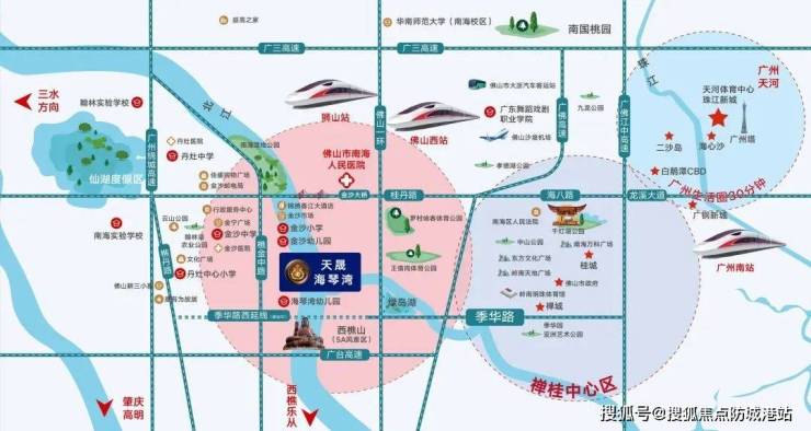 天晟海琴湾地处丹灶金沙核心区,紧邻桂丹路主干道,”四横六纵“快速路网,1个红绿灯直达千灯湖,出入即享广佛双城繁华配套。
