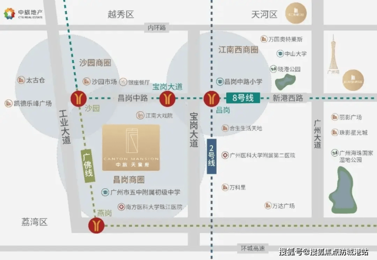 海珠·中旅天宸府位于昌岗路与工业大道交汇处,这里曾是广州工业发源地,如今蜕变为“老城新芯”: