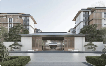 在建筑风格上,山与墅汲取中式建筑精髓,融合现代设计语言,打造极具辨识度的新中式院墅。外立面采用三段式构图,搭配双重批檐、大挑板、金属格栅等元素,选用钢化玻璃与铝板材质,既保留了传统韵味,又彰显现代质感。社区规划借鉴岭南经典园林“余荫山房”的布局手法,采用“梳式布局”与“冷巷”设计,提升通风与遮阳效果。整体空间以“一环一轴、两园两带、七重归家礼序、九雅八趣”为脉络,营造出层层递进的归家仪式感与可游可赏的园居意境,让建筑与自然、文化与生活和谐共生。