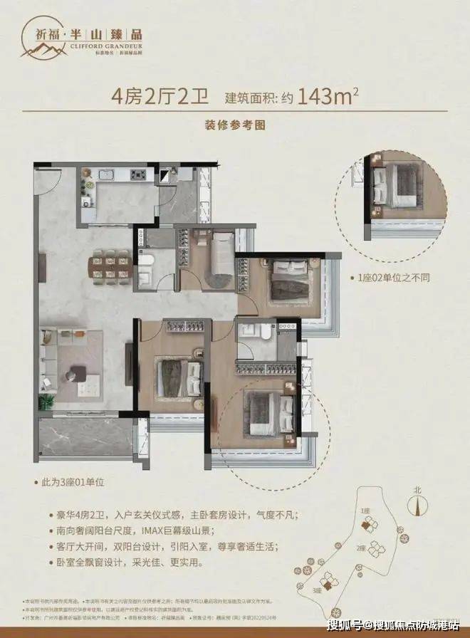 祈福半山臻品提供了多种户型选择,包括建筑面积约82㎡至145㎡的不同房型,旨在满足不同家庭的居住需求。从实用的小两房到宽敞的大四房,每种户型设计都注重舒适性和实用性。例如,82㎡户型布局方正,科学合理,拥有阔景双阳台和奢阔L型厨房;而143㎡户型则突出了大开间客厅和南向大阳台的设计,让居住者能直望IMAX巨幕山景。