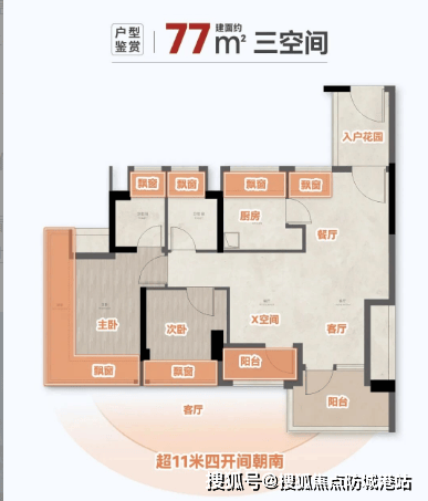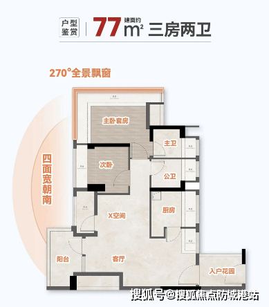 建面约77㎡三房两厅两卫,作为主城核心区低门槛三房产品,总价门槛友好,适配年轻刚需首置人群。户型打造八十㎡以内南向四开间格局,搭配独立入户花园设计,空间灵动实用,双卫配置规避早高峰卫浴使用冲突,贴合三口之家、年轻夫妻日常居住。主卧空间尺度宽裕,搭配二百七十度观景视野,户型分为西南向与东南向两种格局,西南向主卧可眺望江岸景致,东南向低层观赏社区园林,高层俯瞰城市城景,中高楼层可观赏白鹅潭烟花盛景,采光通风条件优越,空间布局方正,动静分区合理,日常居住舒适实用。