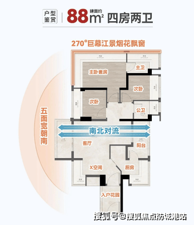 建面约88㎡四房两厅两卫,是片区极具竞争力的爆款户型,主城核心区少见九十㎡以内四房格局,完美适配多子女家庭与三代同堂居住模式,空间利用率拉满,告别户型局促痛点。横厅布局搭配五开间朝南设计,南向整体面宽开阔,南北通透格局优化室内空气流通,适配广州潮湿气候,减少室内潮湿发霉问题。LDKB一体化大通厅设计,融合客厅、餐厅、厨房、阳台空间,拓展公共活动区域尺度,家人互动空间充足,主卧配备观景飘窗,高区房源可远眺江景,空间兼具实用性与舒适度,刚需预算即可解锁改善级居住体验。