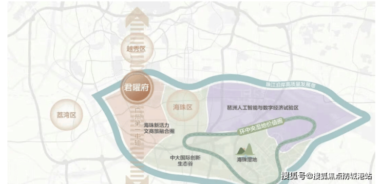 市二宫板块是海珠区的文化根脉与经济发祥地,承载广州千年商都底蕴与广府人文精粹,地处 “滨江岭南文化商圈” 与 “海珠新活力文商旅融合圈” 双圈核心,承接越秀老城烟火气与海珠新城发展势能,是广州主城不可复制的核心居住板块。自 2015 年以来,板块内无任何新增住宅供应,长达十年的断供期导致区域改善需求长期积压,君曜府作为十年唯一新盘,以 “孤品” 姿态入市,填补市场空白,稀缺价值与生俱来。项目占位广州第一中轴南拓首站、海珠桥头堡位置,一江之隔对望越秀核心,是连接珠江南北的关键枢纽,地段价值无可替代。