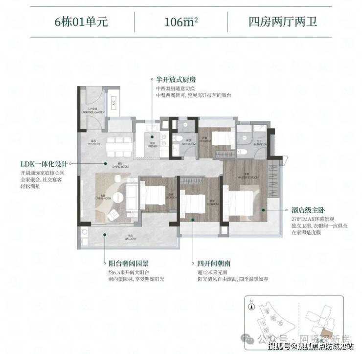 户型搭配大尺度观景阳台,阳台开间跨度约 6.2 米至 8.3 米,宽阔阳台连接客厅空间,延伸室内生活空间,既是居家观景、晾晒休闲、养花品茶的休闲区域,也能拓展居家活动空间。南向宽景阳台直面社区中央园林,居家可观赏内部园林四季景观,视野开阔无遮挡,把社区园林景观融入室内居家生活,提升整体居住观景体验。